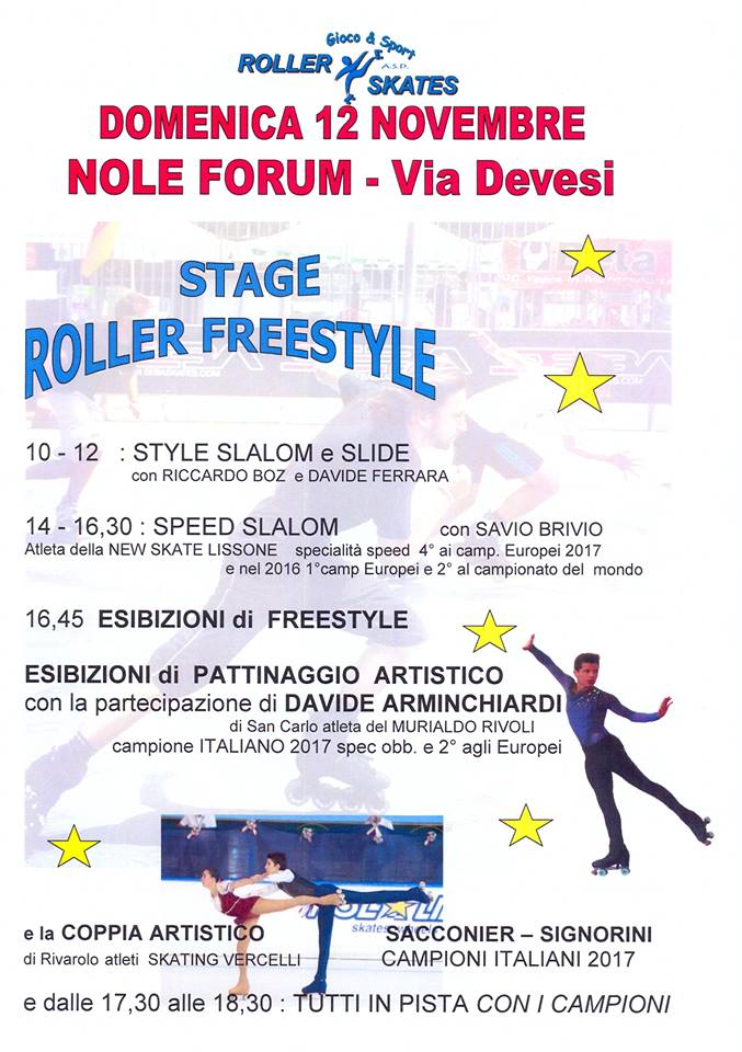 Domenica 12 novembre 2017 l'associazione Gioco & Sport Roller Skates organizza uno stage roller freestyle presso la struttura polivalente "Nole Forum" di via Devesi.