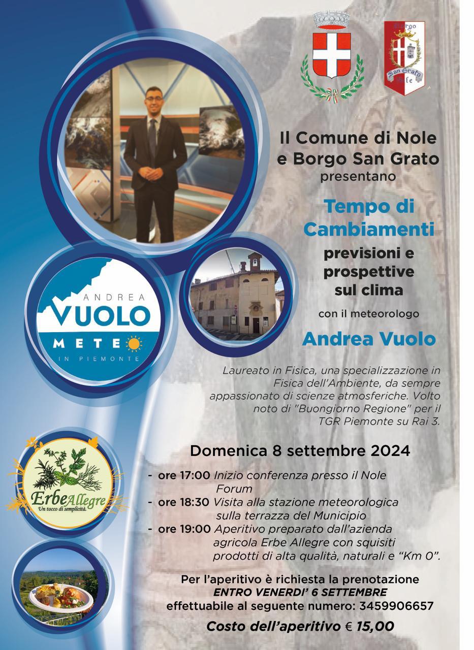 Si informa la cittadinanza che in data 8 Settembre 2024 il Comune di Nole e Borgo San Grato presentano "TEMPI DI CAMBIAMENTI previsioni e prospettive sul clima", si invita pertanto la cittadinanza a partecipare.