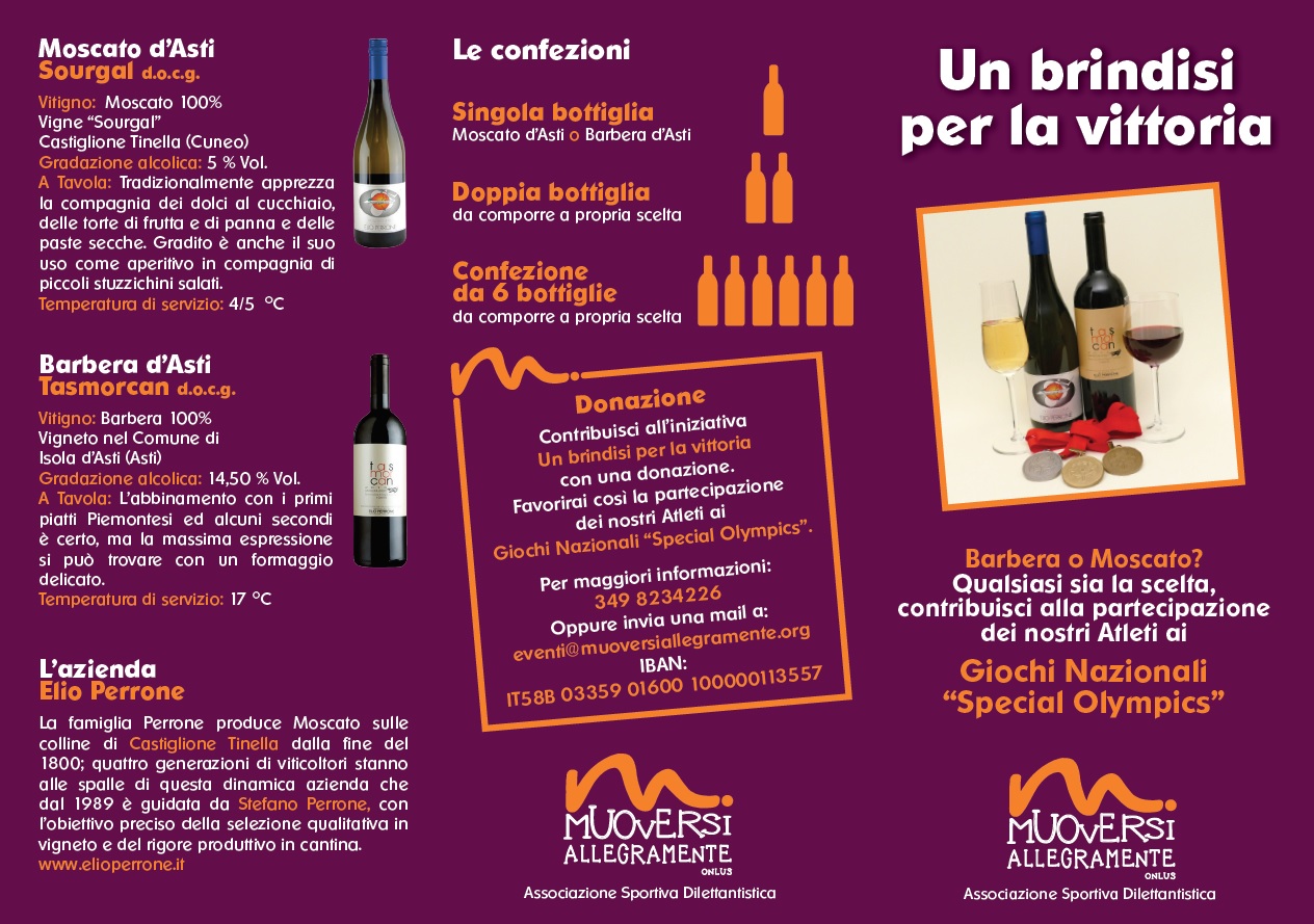“Un brindisi per la vittoria” è una raccolta fondi le cui donazioni (l’offerta minima è di 10€ a bottiglia) saranno utilizzate per favorire la partecipazione dei nostri atleti ai Giochi Nazionali Special Olympics Invernali ed Estivi. I dettagli dell’iniziativa sono indicati nel volantino allegato e liberamente scaricabile.