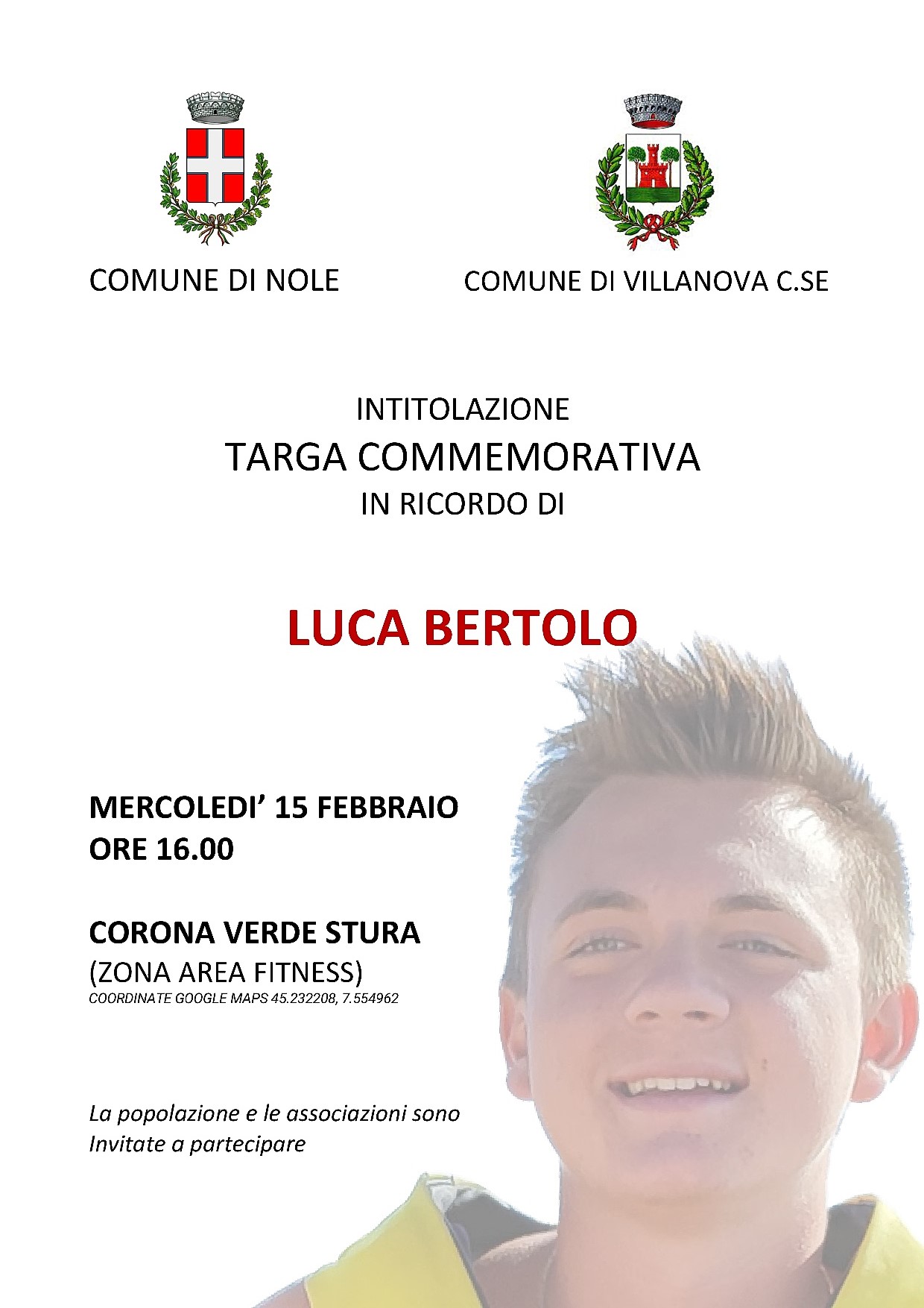 In data 15/02/2023 alle ore 16:00 si terrà presso la Corona Verde (zona area fitness) l'inaugurazione della targa in memoria di Luca Bertolo donata dalle famiglie dei compagni di classe della scuola primaria di Grosso la quale aveva frequentato.