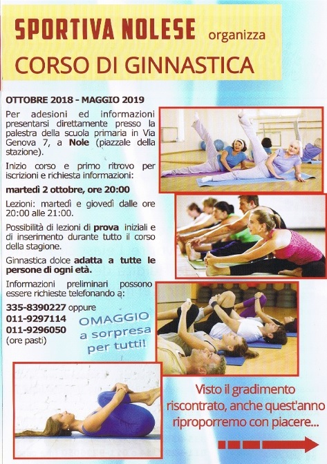 La sportiva Nolese organizza da ottobre 2018 a maggio 2019 un corso di ginnastica.