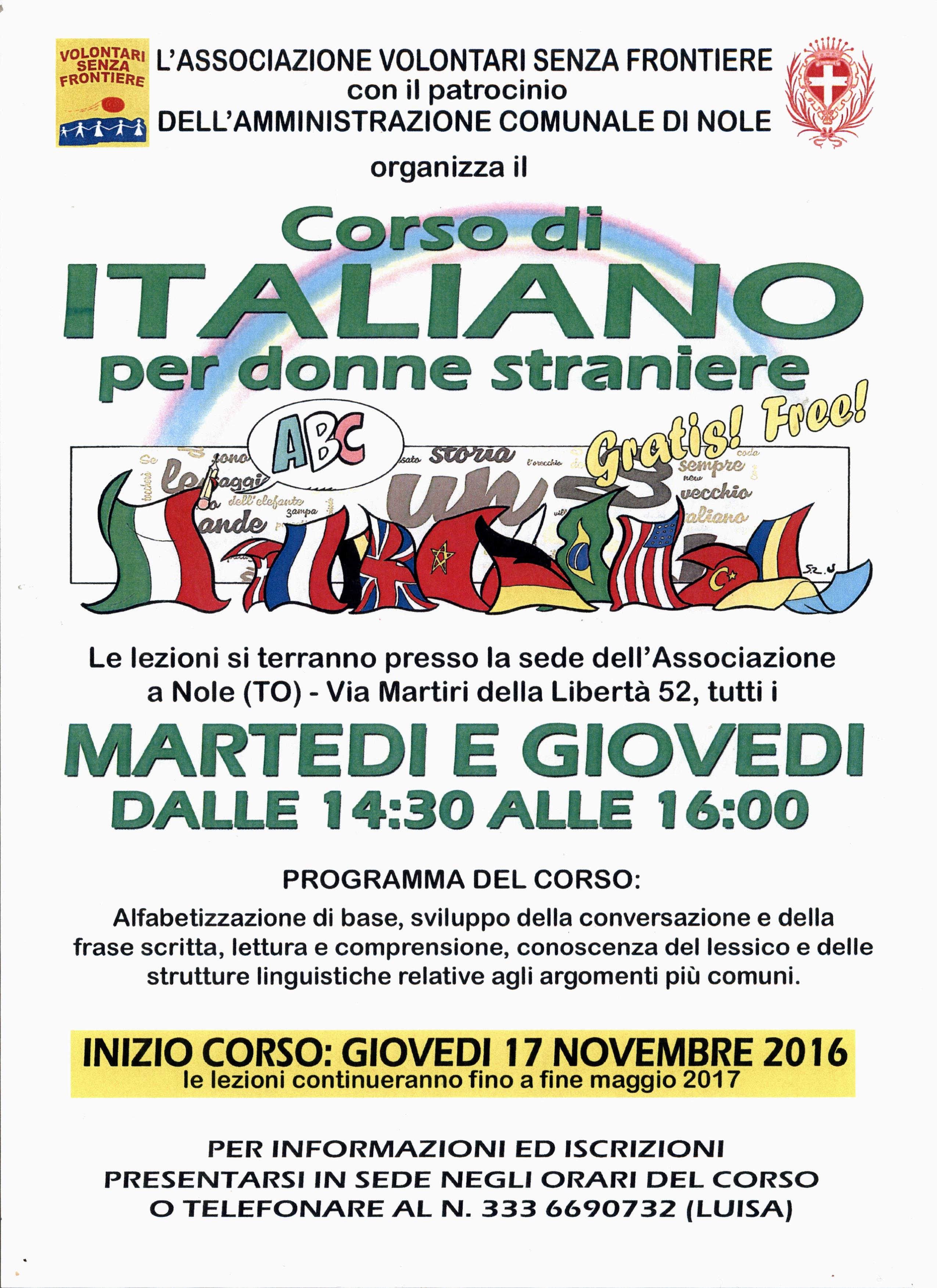 L'Associazione Volontari senza Frontiere, con il patrocinio del Comune di Nole, organizza un CORSO DI ITALIANO gratuito PER DONNE STRANIERE.