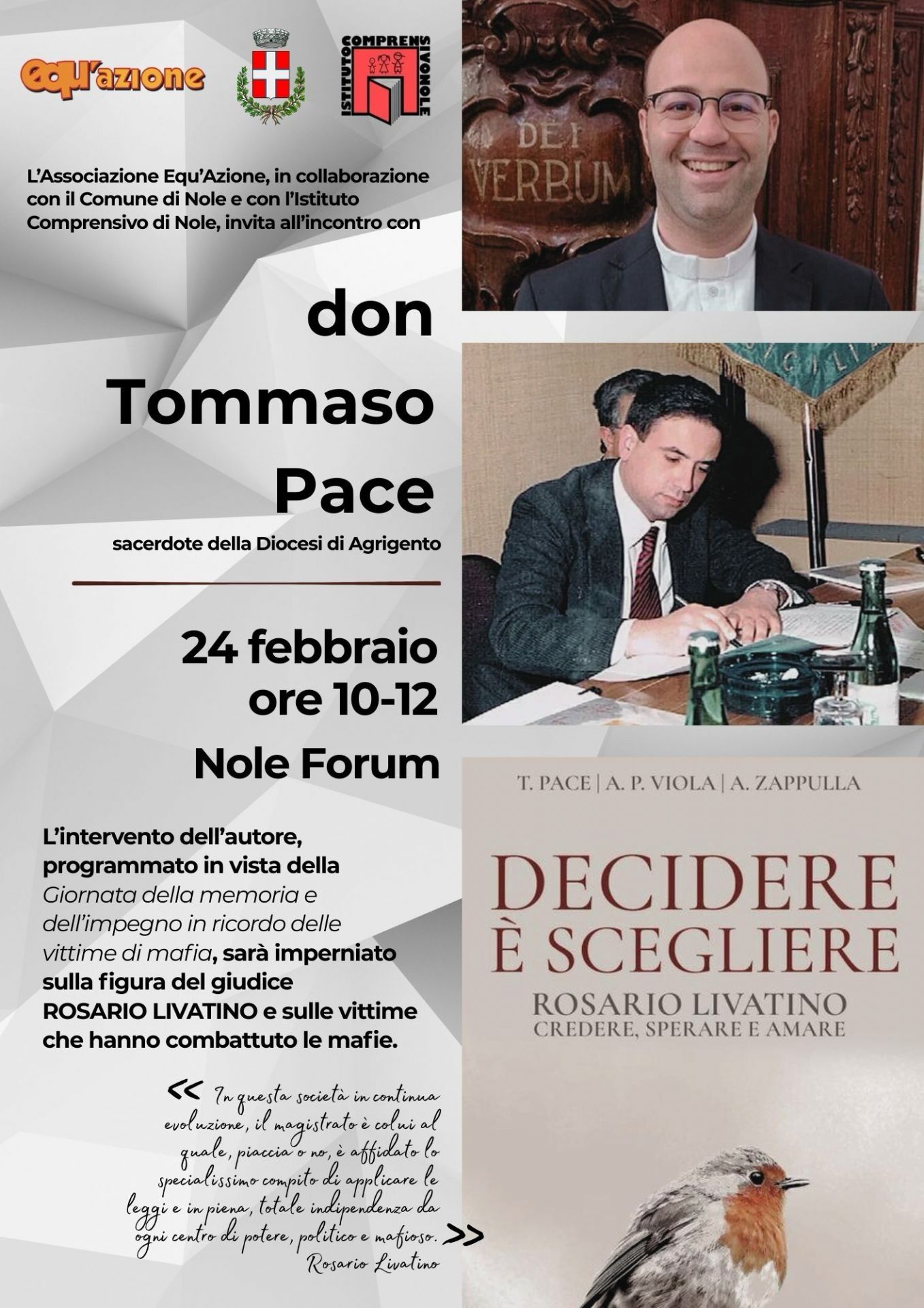 Un momento di riflessione condivisa, rivolto soprattutto alle nuove generazioni, per rinnovare un impegno che non può conoscere pause. In vista della Giornata della memoria e dell’impegno in ricordo delle vittime di mafia, l’associazione Equ’Azione - in sinergia con il Comune di Nole e con l’istituto comprensivo di Nole, promuove un incontro con don Tommaso Pace, sacerdote della Diocesi di Agrigento e autore del volume “Decidere è Scegliere”.