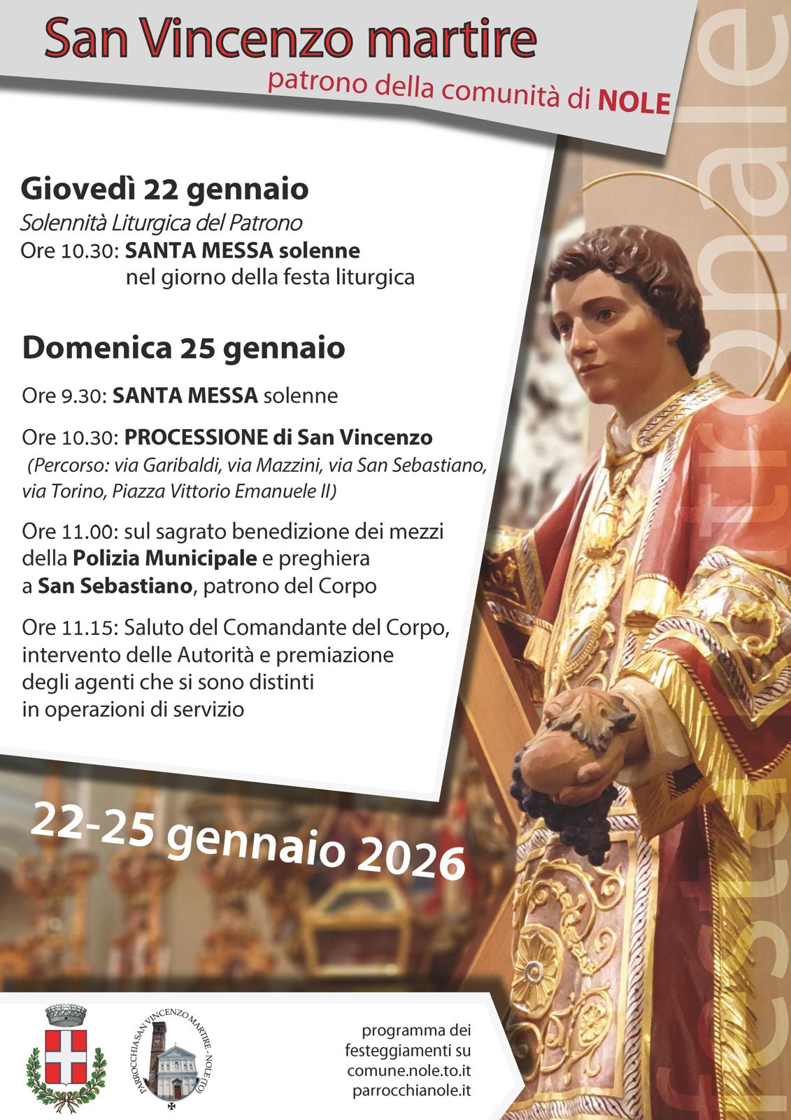 Le celebrazioni proseguiranno domenica 25 gennaio: il via alle 9,30 con la funzione religiosa, seguita alle 10,30 dalla processione di San Vincenzo, che attraverserà le vie del centro storico – via Garibaldi, via Mazzini, via San Sebastiano, via Torino e piazza Vittorio Emanuele II – rinnovando un rito collettivo che da generazioni accompagna la vita del paese. Alle 11, sul sagrato della chiesa, si terranno la benedizione dei mezzi della Polizia Municipale e la preghiera a San Sebastiano, patrono del Corpo, a suggellare il legame tra protezione spirituale e presidio quotidiano del territorio. Alle 11,15 spazio alla parte istituzionale con i saluti del comandante del Corpo di Polizia Municipale di Nole, il dottor Marco Ortalda; e del sindaco Luca Bertino. Ci saranno poi gli interventi delle autorità e infine la premiazione degli agenti che si sono distinti in operazioni di servizio: un momento di riconoscimento pubblico per l’impegno, la professionalità e il senso del dovere dimostrati.