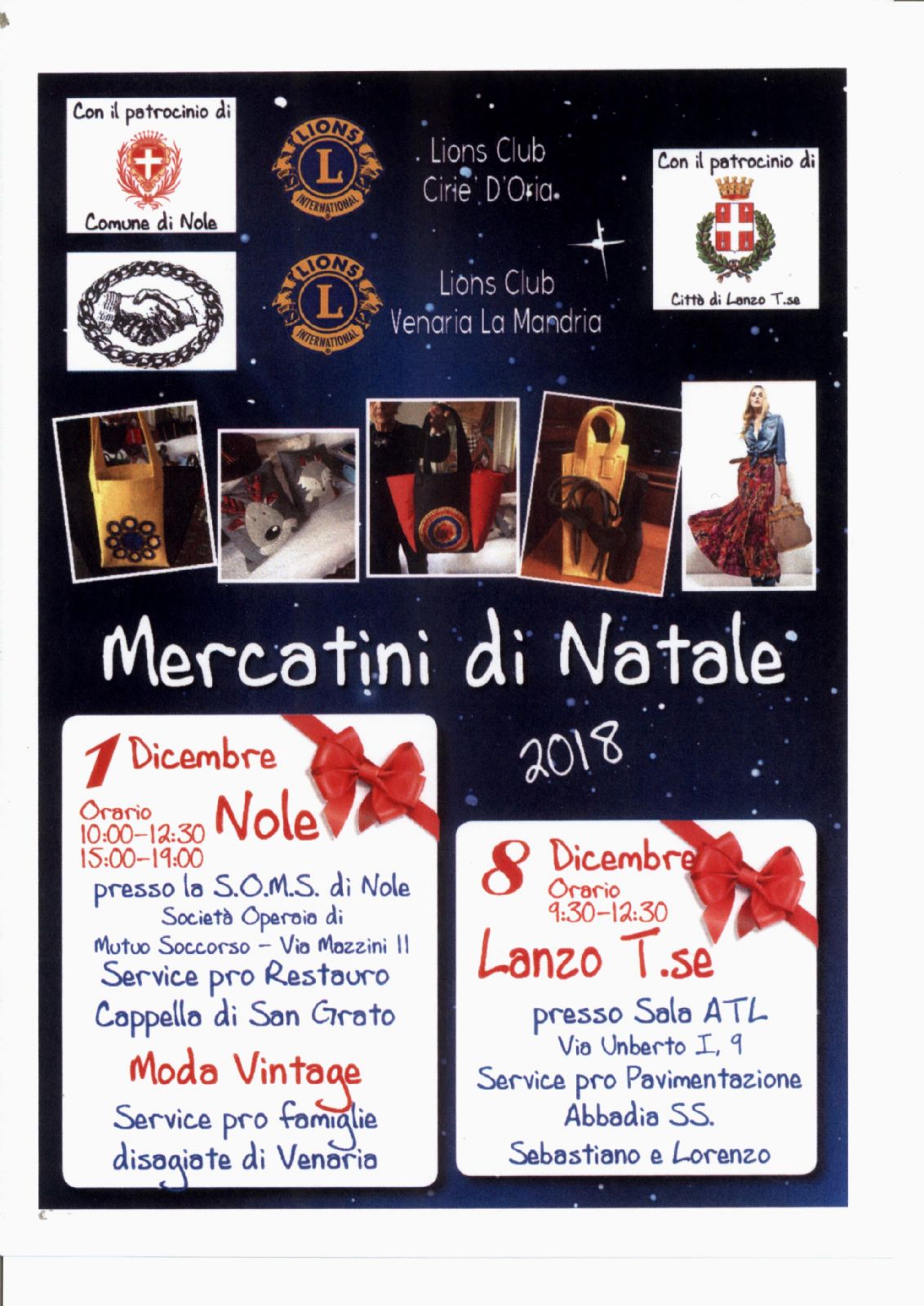 La Società operaia di Nole, in collaborazione con Lions Club Ciriè D'Oria e Venaria La Mandria, organizza i Mercatini di Natale 2018. A Nole il 1° dicembre 2018 presso la Società Operaia di Mutuo Soccorso di via Mazzini.