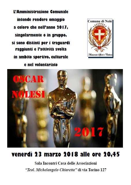 Il prossimo venerdì 23 marzo 2018 alle ore 20,45 si terrà la cerimonia per il conferimento degli "Oscar Nolesi 2017".