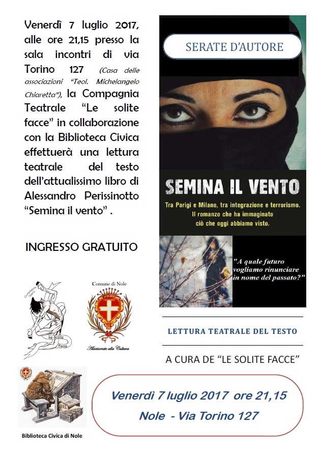 Venerdì 7 luglio 2017, alle ore 21,15 presso la sala incontri di via Torino 127 (Casa delle associazioni “Teol. Michelangelo Chiaretta”), la Compagnia Teatrale “Le solite facce” in collaborazione con la Biblioteca Civica effettuerà una lettura teatrale del testo dell’attualissimo libro di Alessandro Perissinotto “Semina il vento” .