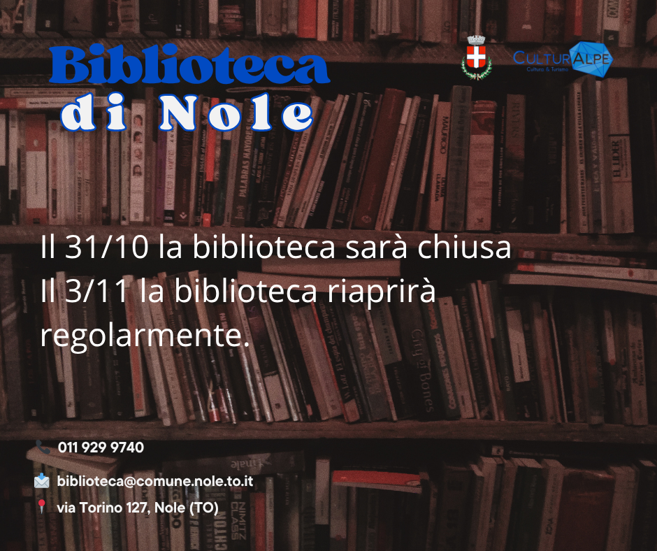 Si informano i cittadini che i giorni venerdì 31 ottobre e sabato 1 novembre 2025 la Biblioteca Civica di Nole rimarrà chiusa.