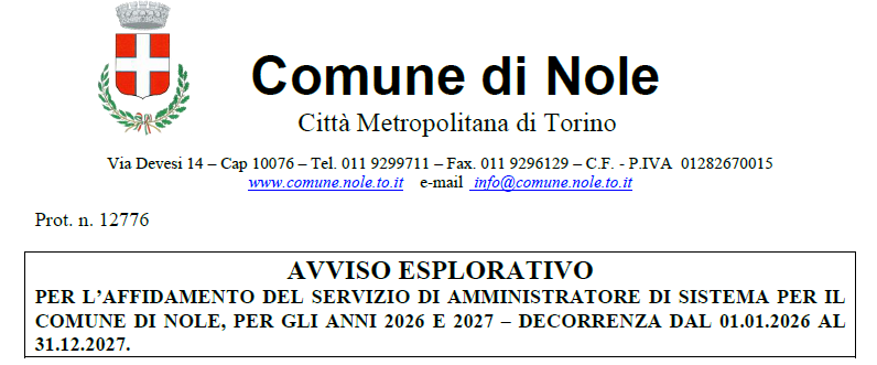 procedura negoziata per all’affidamento del servizio di amministratore di sistema per il Comune di Nole, per gli anni 2026 e 2027 – Decorrenza dal 01.01.2026 al 31.12.2027.