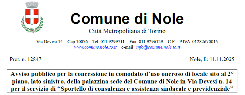 avviso pubblico per la concessione in comodato d’uso oneroso di locale sito al 2° piano, lato sinistro, della palazzina sede del Comune di Nole in via Devesi n. 14 per il servizio di “Sportello di consulenza e assistenza sindacale e previdenziale”