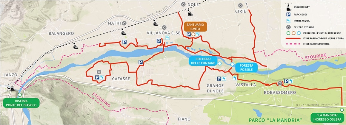 Il progetto Corona Verde Stura è un’iniziativa dei Comuni di Cafasse, Ciriè, Mathi, Nole (comune capofila), Robassomero e Villanova Canavese che consiste in una rete di percorsi ciclo-pedonali finalizzati ad un uso diverificato dell’ambito del Torrente Stura di Lanzo, nell'ottica di una fruizione legata allo sviluppo ed al turismo sostenibile. Principi che, uniti ad iniziative di recupero ambientale, si propongono in continuità con l’iniziativa generale Corona Verde, finanziata dalla Comunità Europea e dalla Regione Piemonte nell'ambito del F.E.S.R. (Fondo Europeo Sviluppo Regionale).